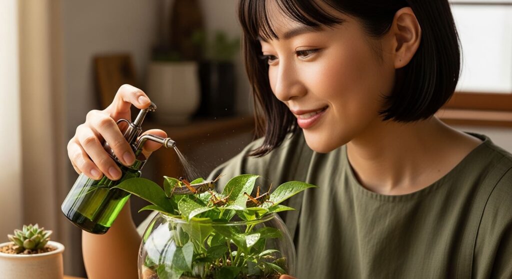 草は採取後に軽く洗い、余分な汚れを落とすとさらに安心です。水は直接与えるのではなく、霧吹きで葉に細かな水滴をつけてあげます。朝と夕方の2回ほど霧吹きをすることで、自然界の朝露や夕露に近い環境をつくれます。葉についた水滴から少しずつ飲めるため、溺れる心配もありません。