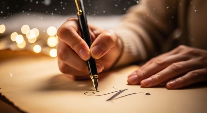 たとえば“S”の最初のカールをふわっと大きめに、文字のつなぎ目を滑らかに、線の終わりを軽く跳ねさせると、まるで風に乗ってそっと届けられるサンタさんのサインのように見えます。