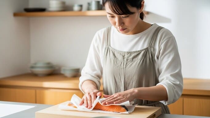 臭みの多くは、鮭の身の中ではなく表面にあります。特に、切り身の表面に残った水分や血合いは、加熱によって一気ににおいとして立ち上がりやすい部分です。そのため、流水で洗い流すよりも、キッチンペーパーなどで押さえるように拭き取る意識が重要になります。洗いすぎると旨みまで流れてしまうため、「取るべきものだけを静かに取り除く」という感覚で扱うのがポイントです。