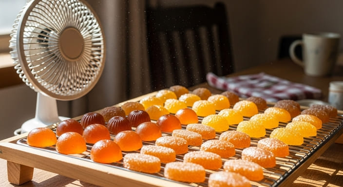 もう少し丁寧に言うと、乾燥の成否は“空気の流れと湿度のバランス”で決まります。琥珀糖は表面が乾き始めたあとも内部に水分を含んでおり、湿度が高いと表面に水分が戻ってベタつくことがあります。特に梅雨や夏場は湿気がこもりやすいので、扇風機やサーキュレーターを低速で回し、常に空気を循環させましょう。直射日光の下ではなく、日陰で風通しの良い場所がベストです。