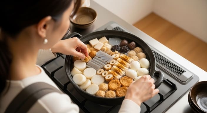 例えば、牛すじや練り物など味の強い具材は外周に円を描くように置き、中央には大根・卵・こんにゃくなど味を吸いやすい具材をまとめると、味の流れが自然と抑えられます。さらに、具材の間に“空気の通り道”を作るように少し隙間を空けておくと、煮汁の移動が緩やかになり、味移りが格段に減少。