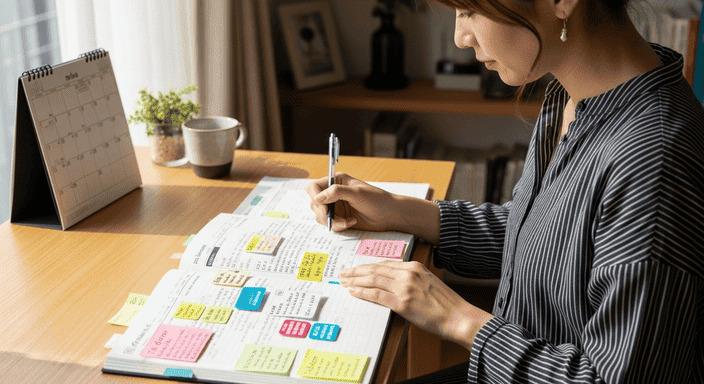 予定とタスクを分けて管理する方法は、手帳を使いこなすうえで最も基本的でありながら、効果が大きい使い方のひとつです。マンスリーには「動かせない予定」を書き、ウィークリーには「行動に落とし込むタスク」を書くことで、視覚的にも頭の中でも整理が進みます。
