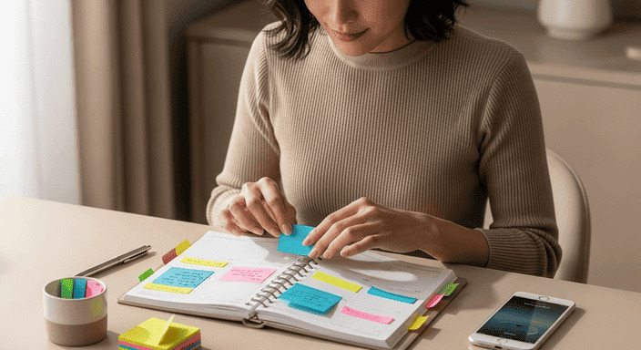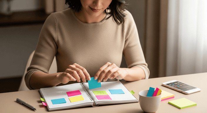 ふせんやシールは、手帳の“使いやすさ”と“楽しさ”を一気に底上げしてくれる万能アイテムです。とくにふせんは、予定が変わりやすい人やタスクの移動が多い人にとって、ストレスを減らす大きな味方になります。仮の予定・リスト化したいタスク・買い物メモなどをふせんに書いてウィークリーやマンスリーに貼れば、必要に応じて簡単に位置を移動でき、ページを汚さずに管理できます。