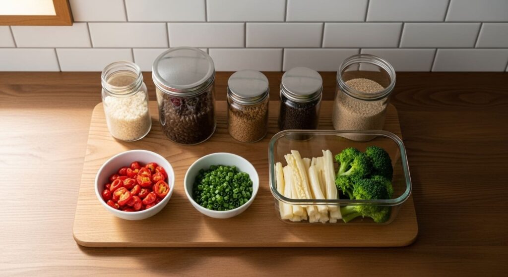 さらに、具材によって“戻りやすさ”が異なるため、乾物が中心なら朝仕込みで十分。厚みのある乾燥豆腐や切り干し大根を使う場合は、熱湯を注いだあと1分ほど蓋をせず蒸らすと、より均一に戻ります。