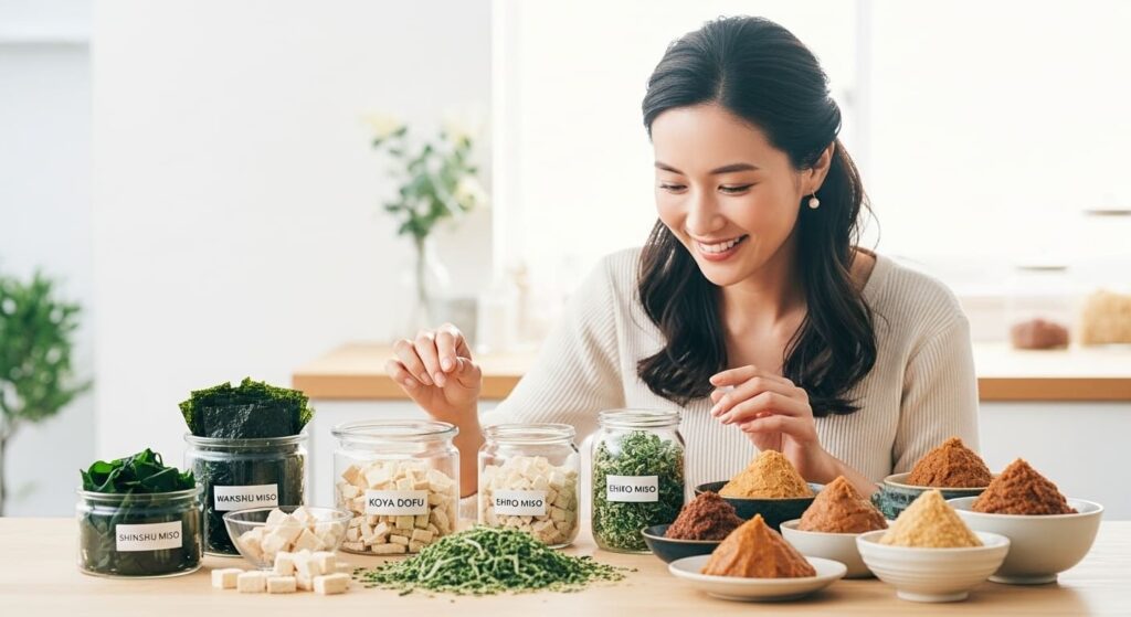 まず味噌は、赤味噌系と合わせ味噌の2種類を用意すると、味のバリエーションが広がり飽きにくくなります。乾物具材はわかめ・麩・ねぎ・切り干し大根・乾燥豆腐など、戻りが早く扱いやすいものを中心に5種類ほどセットしておくと便利です。