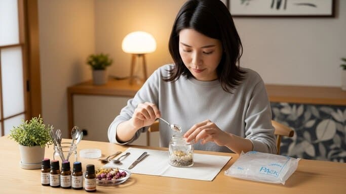 フタを完全に閉めず、布やガーゼをかぶせて輪ゴムで留めると、香りの広がり方を調整できるのもポイントです。見た目を重視したい場合は、瓶の外側にリボンを巻いたり、ラベルを貼ったりすることで、より自分好みの雰囲気に仕上げることができます。