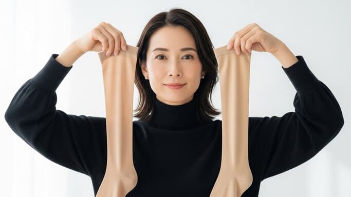 着圧や透け感も、ストッキングの色印象を左右する重要な要素です。着圧が強いタイプほど、生地が脚に密着し、影が強調されやすくなります。そのため、同じヌードベージュやナチュラルベージュでも、着圧タイプではワントーン暗く見えることがあります。
