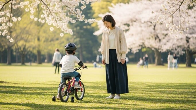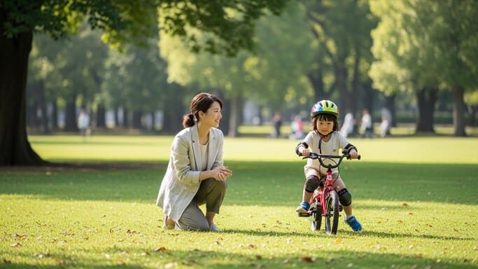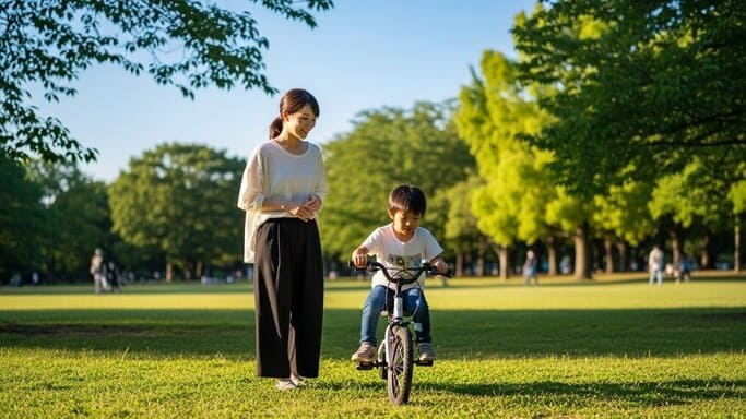 自転車の練習では、成功体験を積める環境づくりが何より大切です。いきなり長距離を走らせたり、周りと比べたりすると、子供はプレッシャーを感じやすくなります。