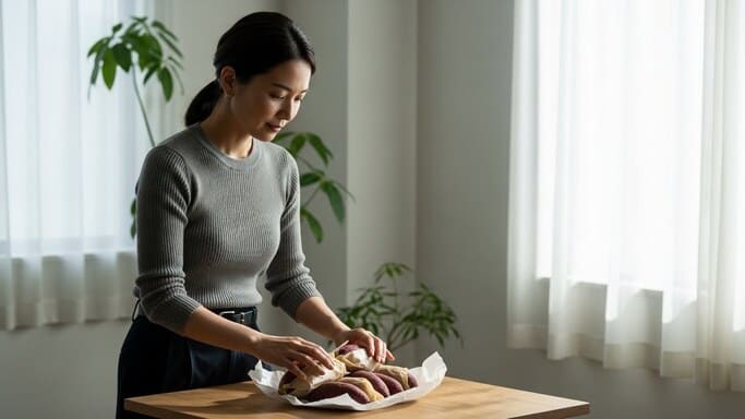 常温で保存する場合は、焼き芋が直接空気や光にさらされないようにすることが重要です。新聞紙やキッチンペーパーでやさしく包み、余分な湿気を吸わせつつ、直射日光の当たらない風通しの良い冷暗所に置きます。袋に入れて密閉してしまうと、内部に湿気がこもり、かえって傷みやすくなるため注意が必要です。また、床暖房の近くや家電の放熱がある場所は避け、できるだけ温度変化の少ない場所を選びましょう。