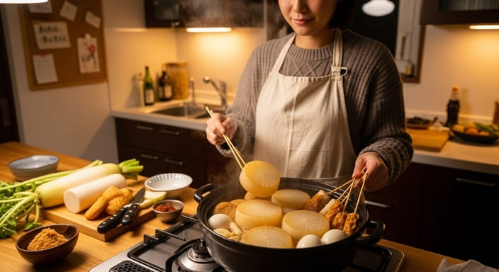 冬大根は繊維がやわらかく、加熱すると中まで味が染み込みやすくなります。じっくり火を通すことで、細胞の間にだしや調味料が入り込み、甘みがさらに引き立ちます。低めの温度で時間をかけて煮ると、外側は崩れにくいまま、中心はトロッとほどけるような食感に仕上がります。下茹ででえぐみを抜いてから煮ると、味の輪郭がはっきりし、だしの旨みもより感じやすくなります。煮崩れしにくいのも、冬大根の大きな魅力で、見た目よく仕上げたいおでんや含め煮に向いています。