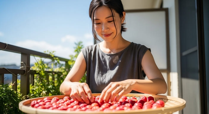 梅雨明け後の晴天が続く時期が理想です。天気予報を確認し、少なくとも2〜3日連続で晴れる見込みがある日を選びましょう。雨や曇りが続くと十分に乾燥せず、途中で湿気を含んでしまうことがあります。白梅酢から梅を取り出す際は、清潔な手や箸を使い、やさしく扱うことも大切です。表面の白梅酢を軽く切るようにしてザルや干し網に並べ、梅同士が重ならないよう間隔をあけて配置します。こうすることで風通しが良くなり、均一に乾きやすくなります。